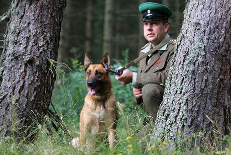 Pohraničník a hraničářský pes čekají na narušitele...